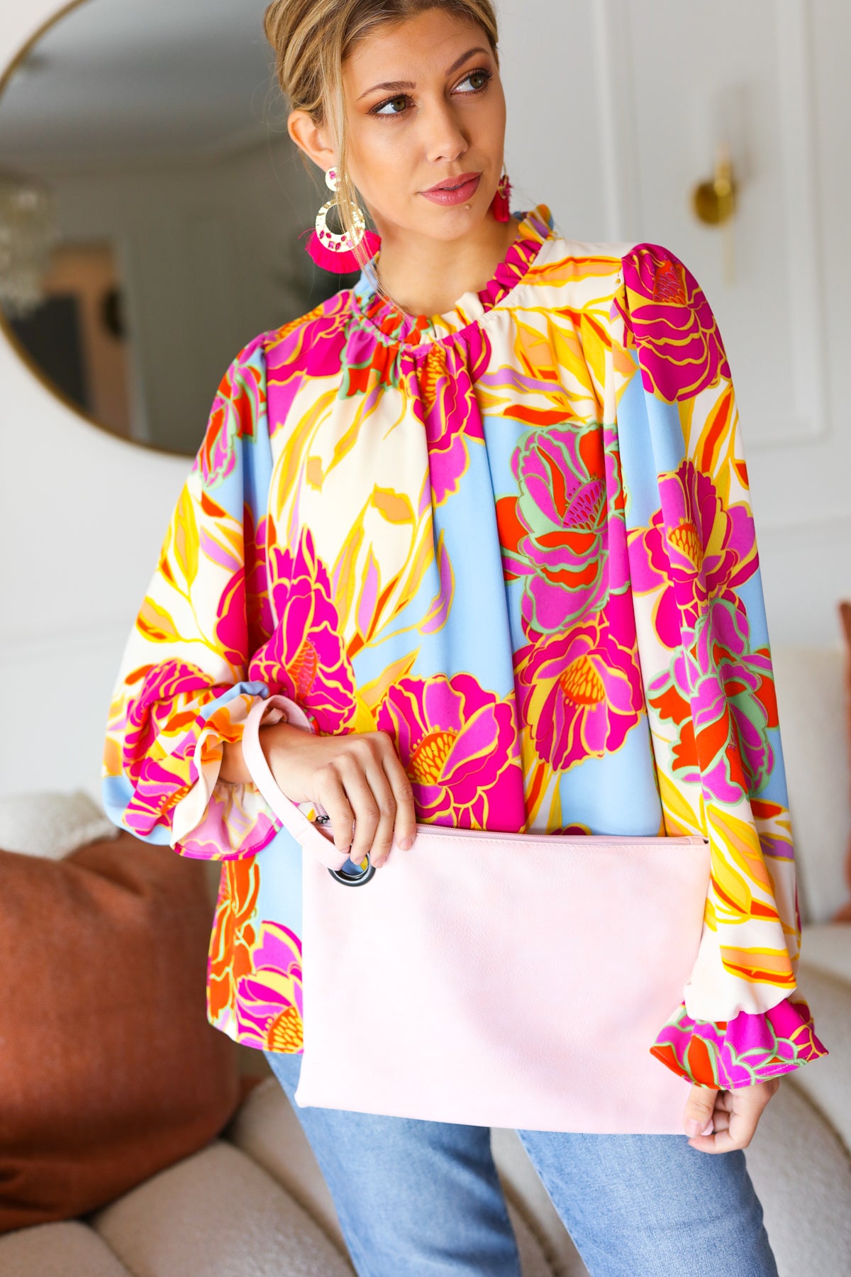 Blush Faux Leather Handle Zipper Clutch