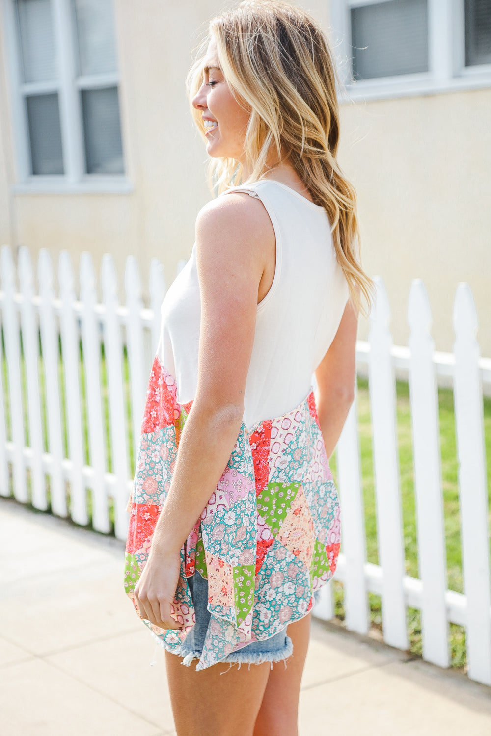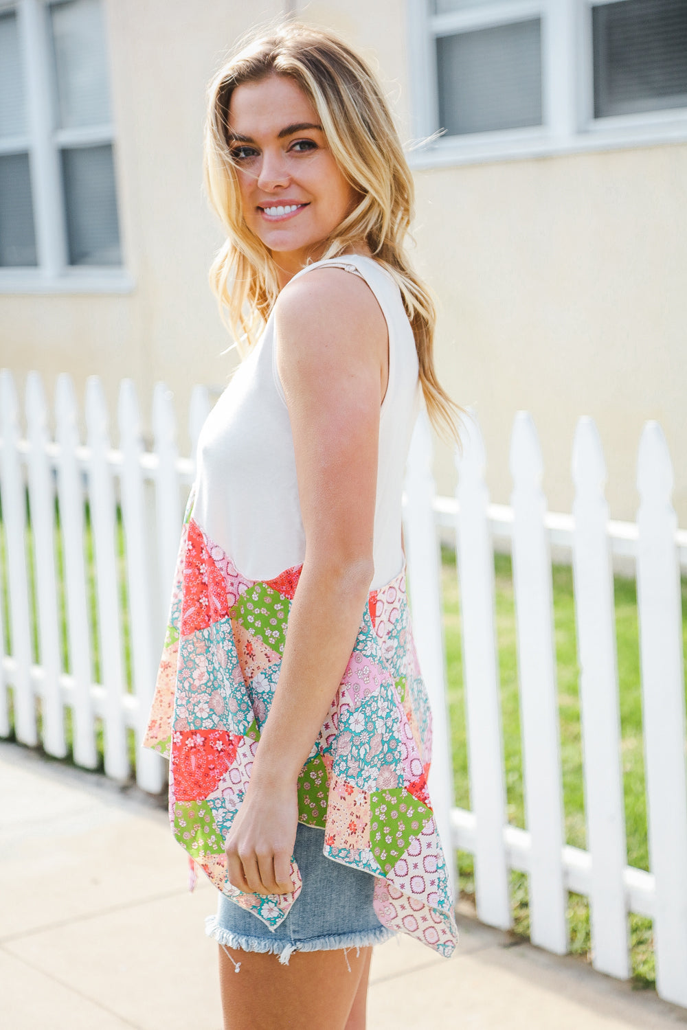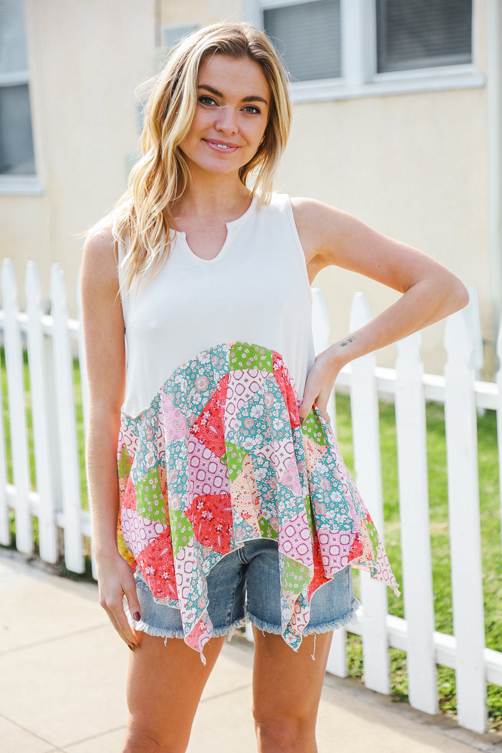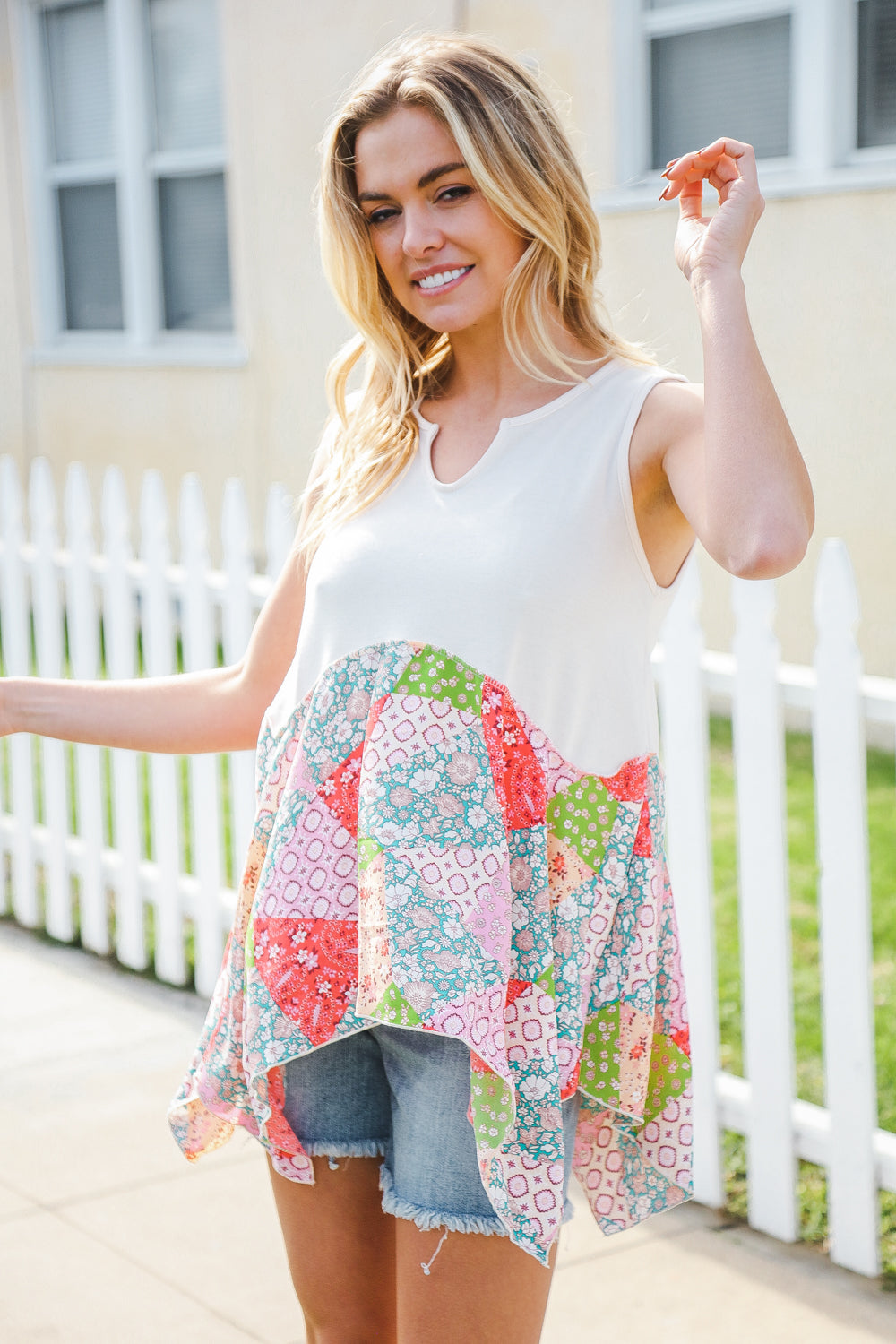Regular price $16.95 Sale price $5.50Bring on sun, sandals and all-things-feminine with this terry notched neck sleeveless top featuring a patchwork print and shark bite hemline. Step into summer with confidence in this color block, flattering style!