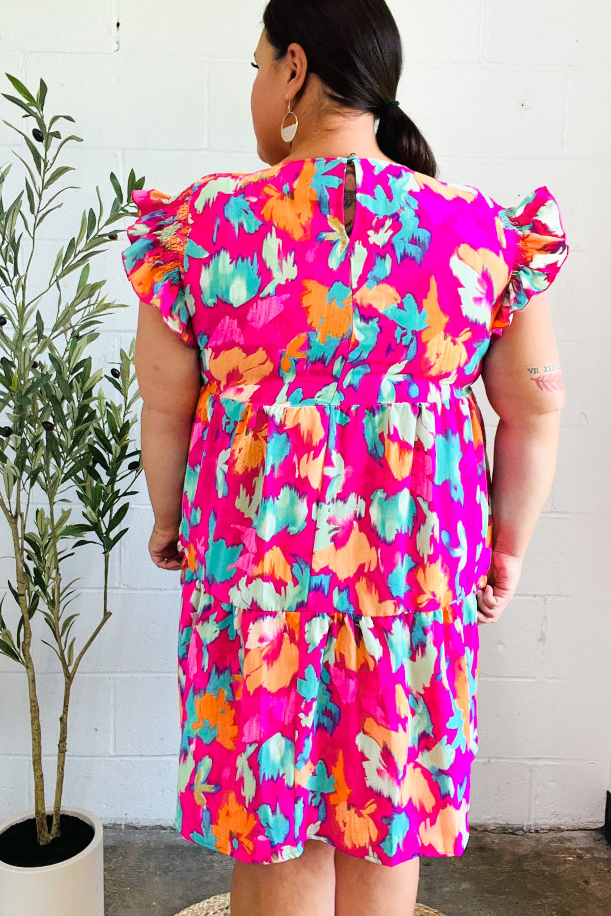 Look of Love Fuchsia Abstract Floral Print Smocked Ruffle Sleeve Dress