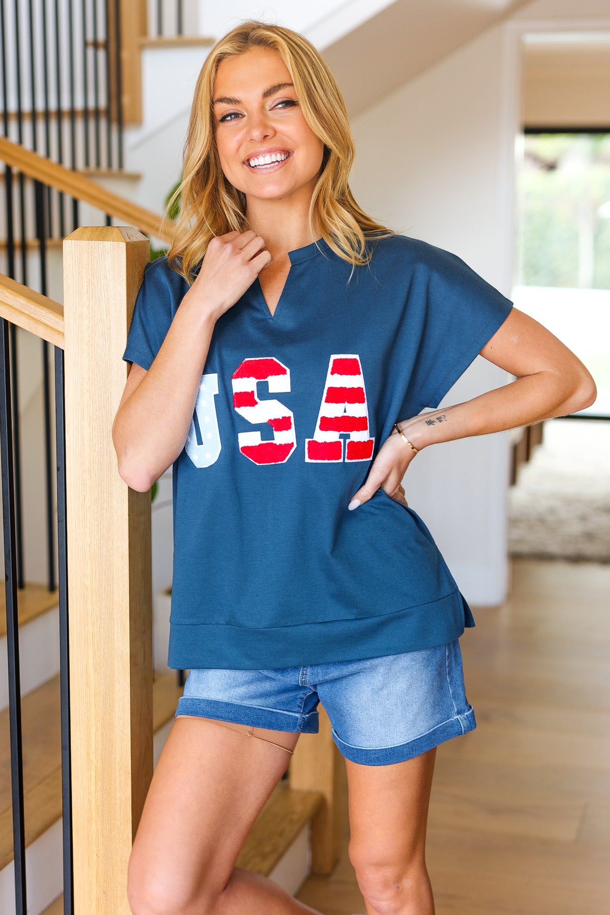 Regular price $18.55 Sale price $11.55Slip on this USA embossed patch top featuring a notched neck, dolman short sleeves, and side slits. Get your adorable on with this fun patriotic top!
